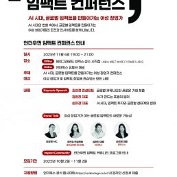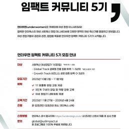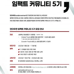 APPLY 전체 모집 APPLY 종료 APPLY모집2025 언더우먼 임팩트 컨퍼런스 참여 신청~ 11월 2일(일) 23:39까지 APPLY모집2025 언더우먼 임팩트 커뮤니티 5기2025.10.2(목) ~ 11.9(일), 23:59까지 종료APPLY한국공항공사와 함께하는 2025 KAC 대학생 창업 아이디어톤~2025. 09.04 (목) 17:00 종료APPLY[연장모집] 2025년 한국외국어대학교 소상공인 디지털특성화대학 5·6기~2025. 08. 16.(토) *연장모집 종료APPLYSeoul AI Young Track (SAY Track)- 2025.06. 27 15:00 종료APPLYDO:NE 제주 런케이션 프로그램 참여자 모집- 2025.05. 11 종료APPLY2025 하나 소셜벤처 유니버시티 모집- 2025.05. 23 16:00 종료2025년 온라인 브랜드 소상공인육성사업(TOPS 프로그램) 모집- 2025.04.10 종료2025 경기도 임팩트 프랜차이즈 성공모델 후보군 모집- 2025.04.08 종료[(~12/2) 두나무 x 티오리] Web3보안 최고 전문가 양성과정 UPSide Academy 2기 모집!- 2024.12. 2 종료2024 언더우먼 임팩트 커뮤니티 4기 참여자 모집- 2024.11.6 종료‘빛나는인재: 창업본색’ 모집 안내- 2024.10.9.