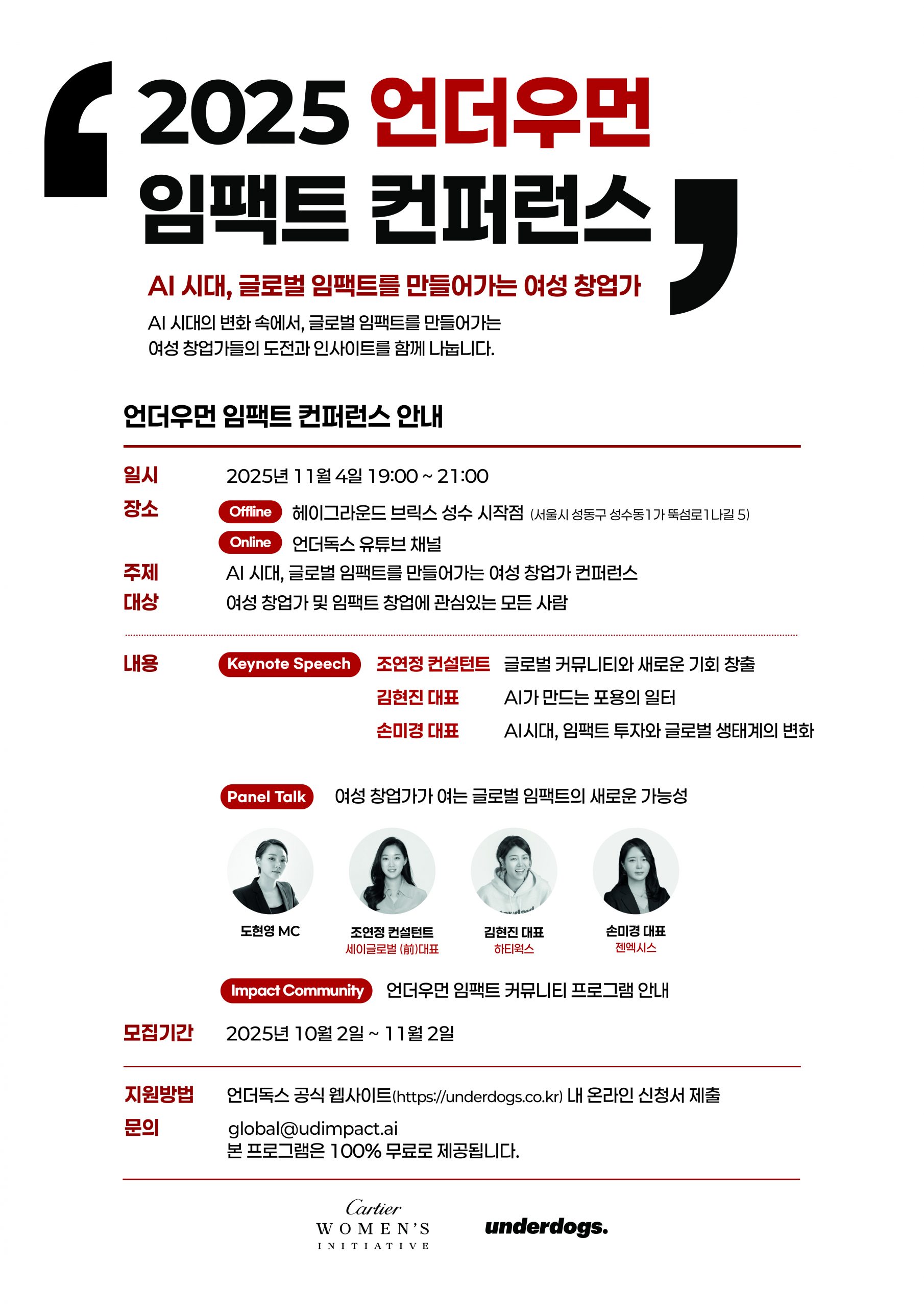 소셜 임팩트를 만들어가는 여성 창업가 정신을 알리기 위해 까르띠에 여성 창업 이니셔티브와 언더독스가 협력한 ‘2025 언더우먼 임팩트 컨퍼런스’가 오는 11월 4일, 헤이그라운드 브릭스 성수시작점에서 막을 올립니다!